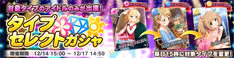 『アイドルマスター シンデレラガールズ スターライトステージ(デレステ)』にて12月14日(水)15:00より、対象タイプのみ出現する「タイプセレクトガシャ」が開催されました。