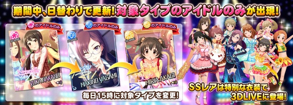 毎日15時に対象のタイプが変わるので、お迎えしたいアイドルの属性が出現する日程をチェックしておきましょう!