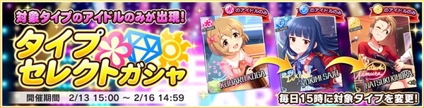 本日2018年2月13日(火)15:00より、対象のタイプのアイドルのみが出現する「タイプセレクトガチャ」が開催されました。