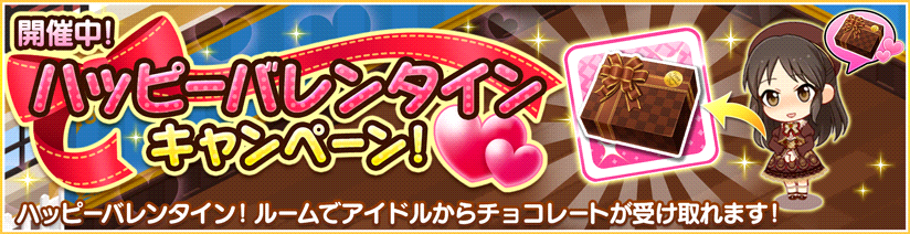 下記期間中にルームにアクセスすると、アイドルから特別アイテム「手作りチョコレート〜2019〜」を受け取ることができます。