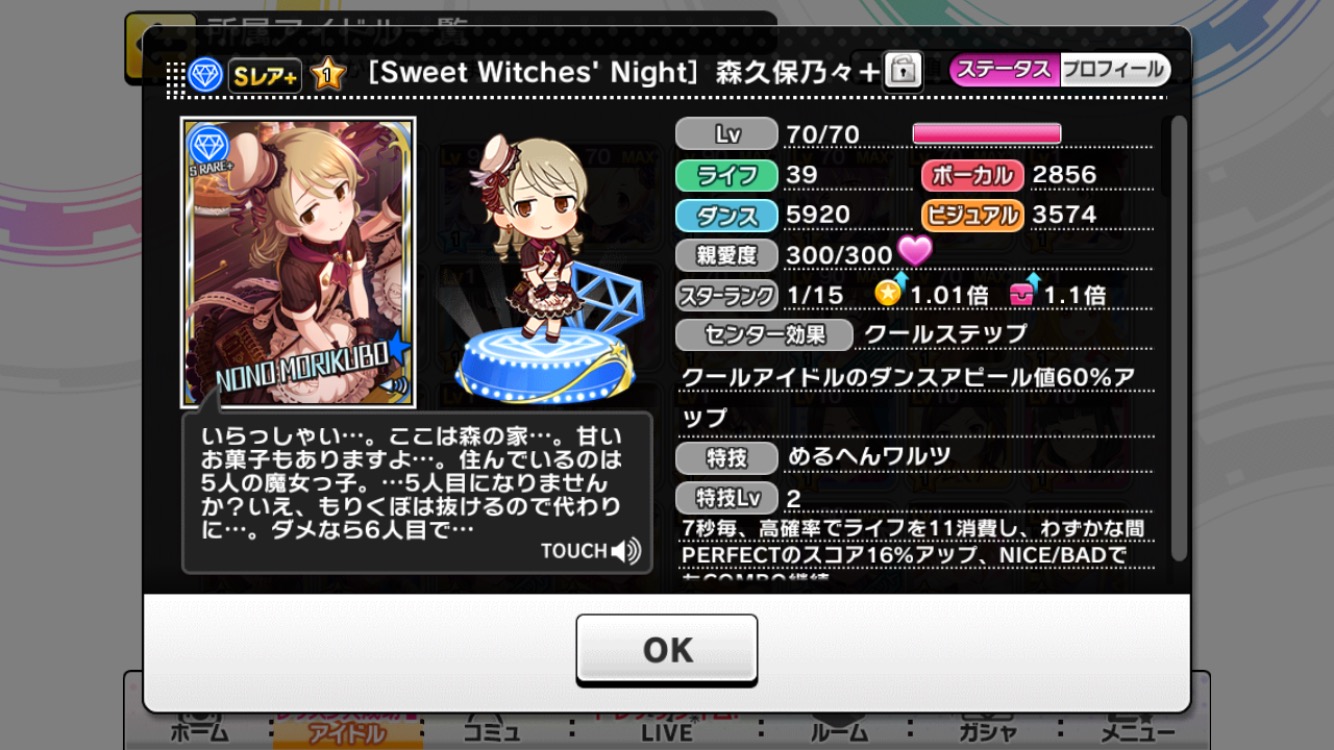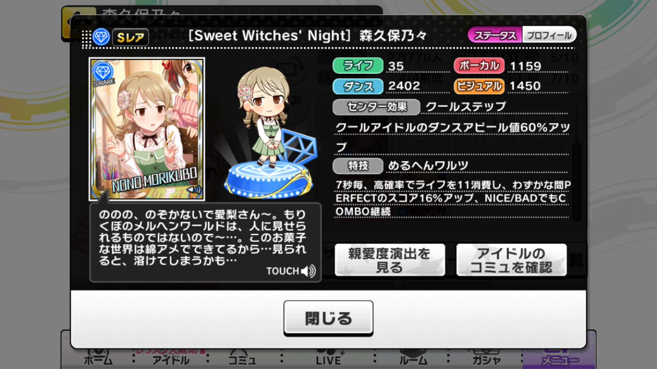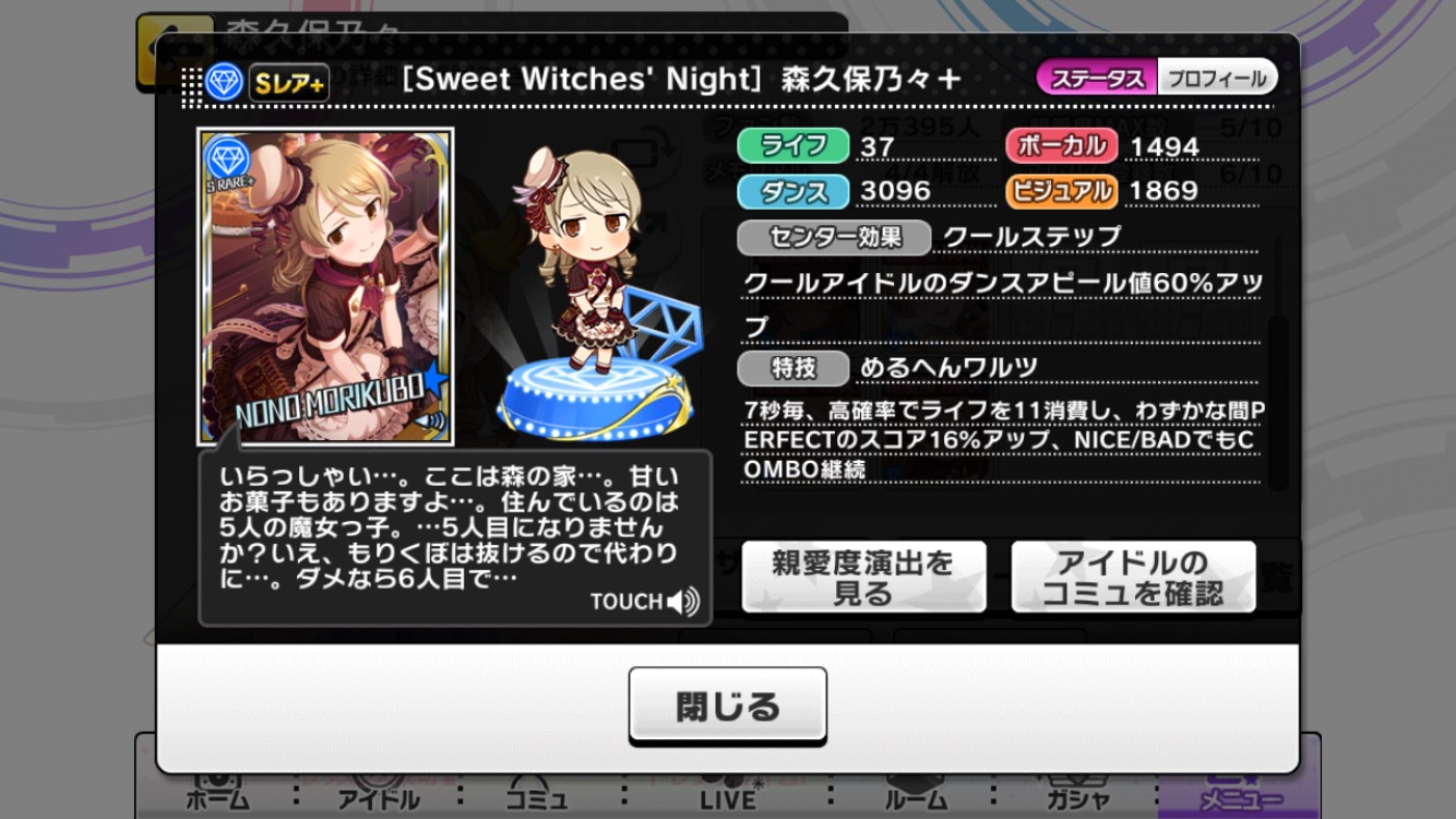特技 | めるへんワルツ 7秒毎、高確率でライフを11消費し、わずかな間PERFECTのスコア16%アップ NICE/BADでもCOMBO継続 |