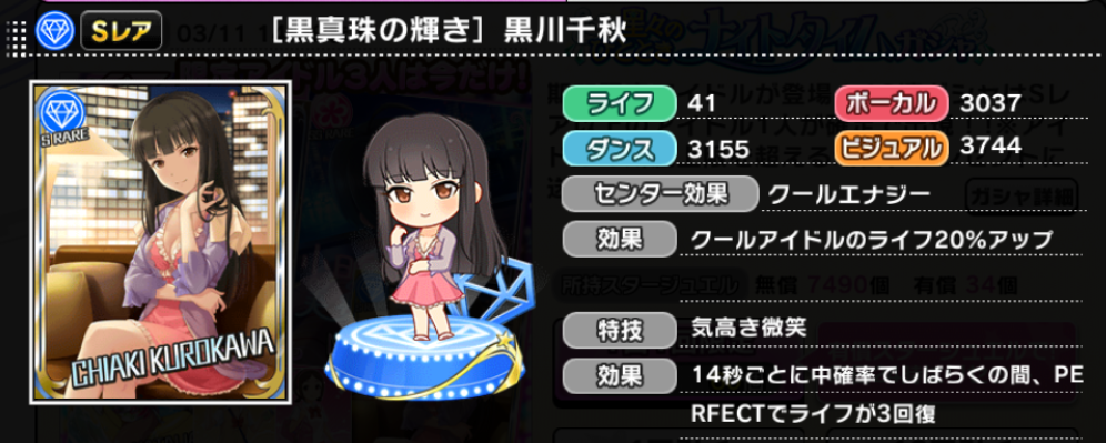 「SSR [夜風の誘い]高垣楓」と「SSR [ユースフルロマンス]小日向美穂」、「SR [黒真珠の輝き]黒川千秋」は期間終了後、通常ガシャには追加されないので、このチャンスをお見逃しなく!