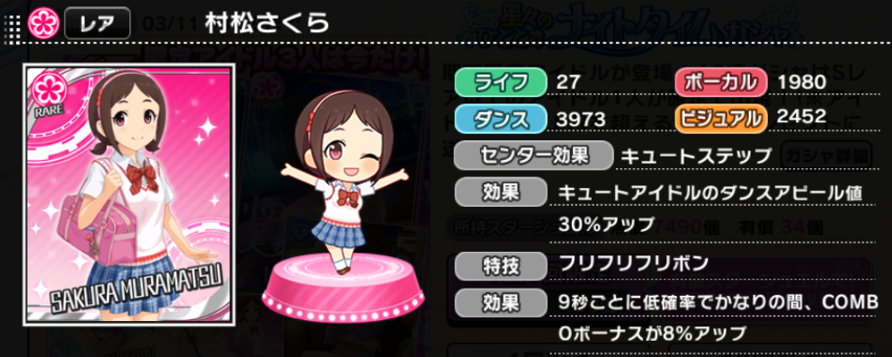 以前実装された大石泉、それと今回のガシャで初登場した村松さくらと一緒に、ユニット「ニューウェーブ」として活躍している15才。