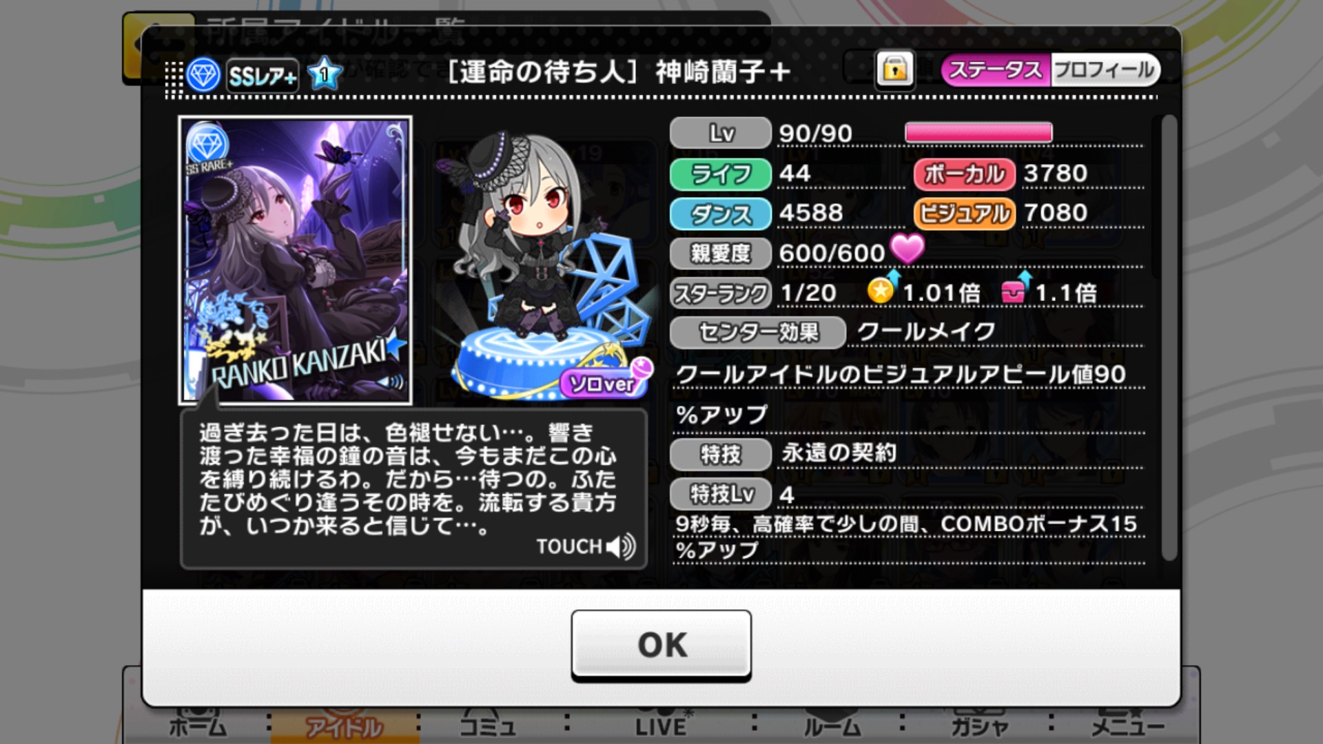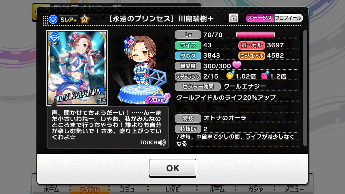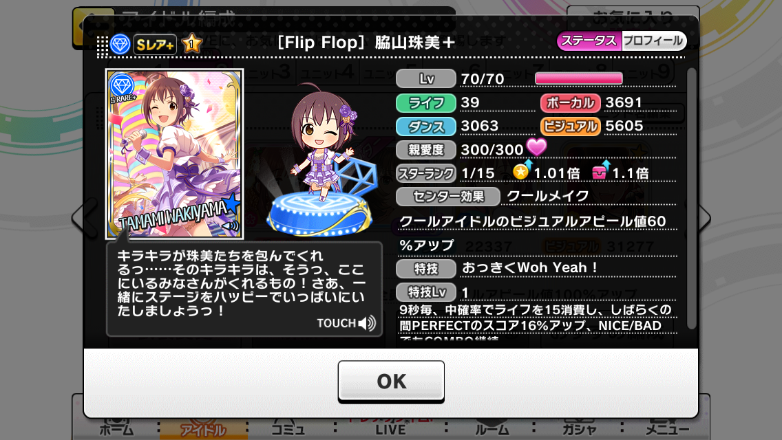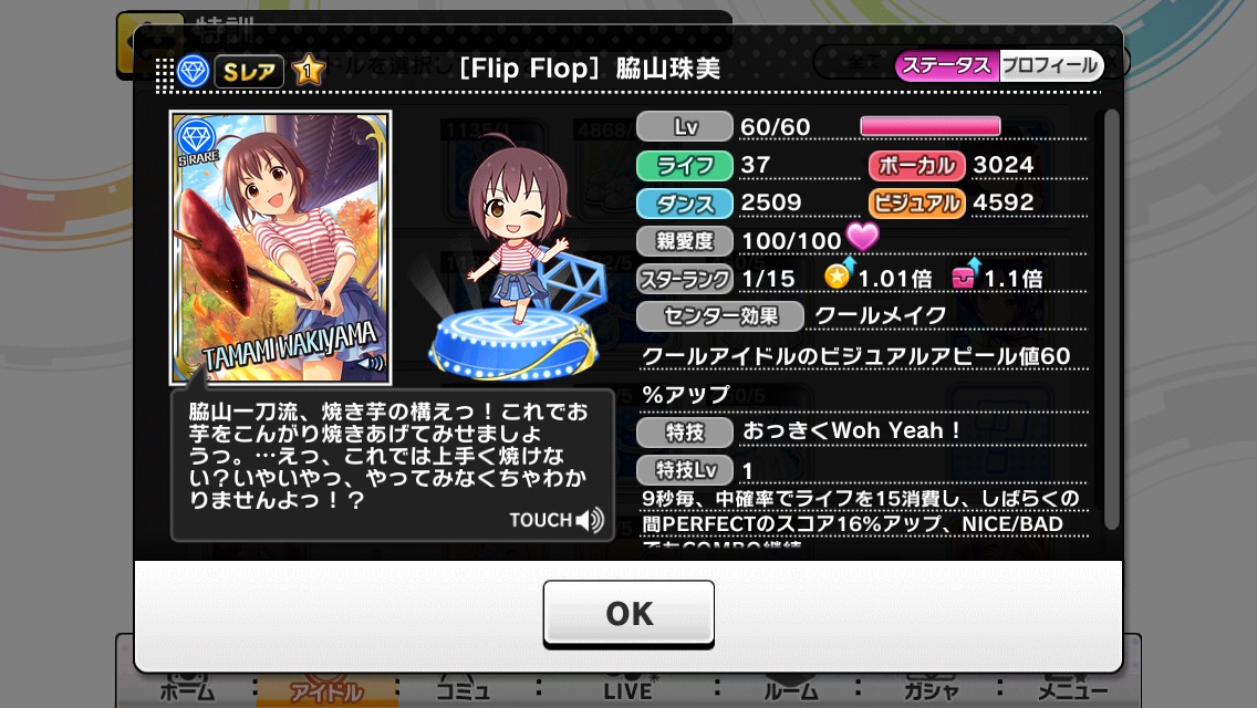 特技 | おっきくWoh yeah! 9秒毎、中確率でライフを15消費し、しばらくの間PERFECTスコア16%アップ NICE/BADでもCOMBO継続 |