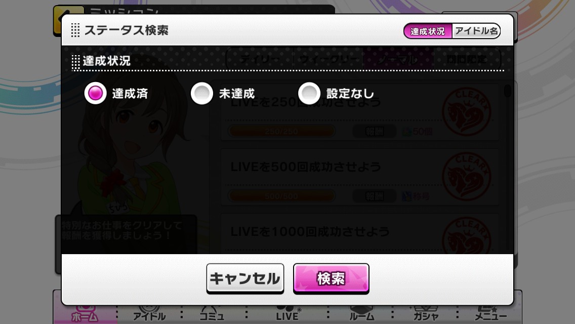 ミッションを達成・未達成で絞り込むことができます。膨大な数のミッションがあるので、これからは手軽に確認できるようになりますね!