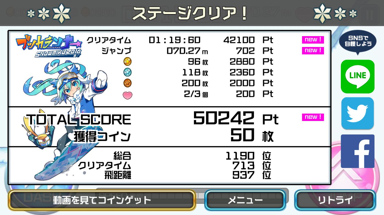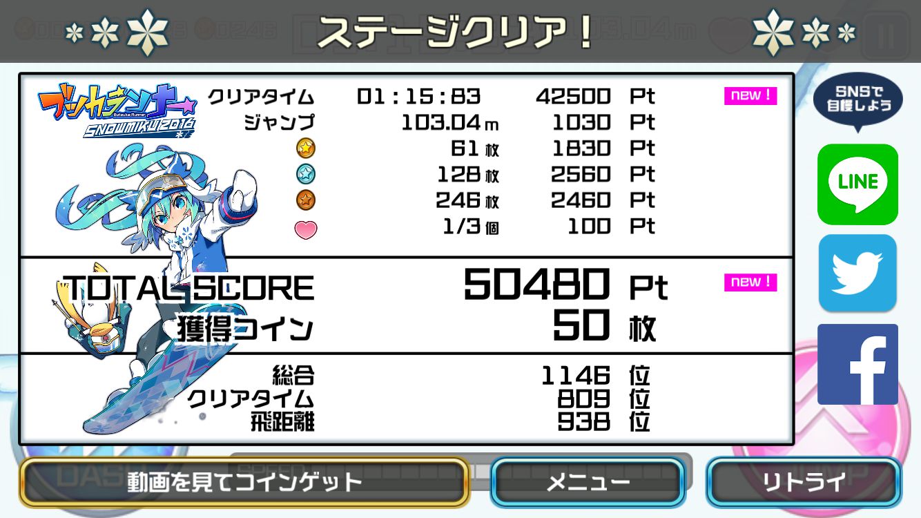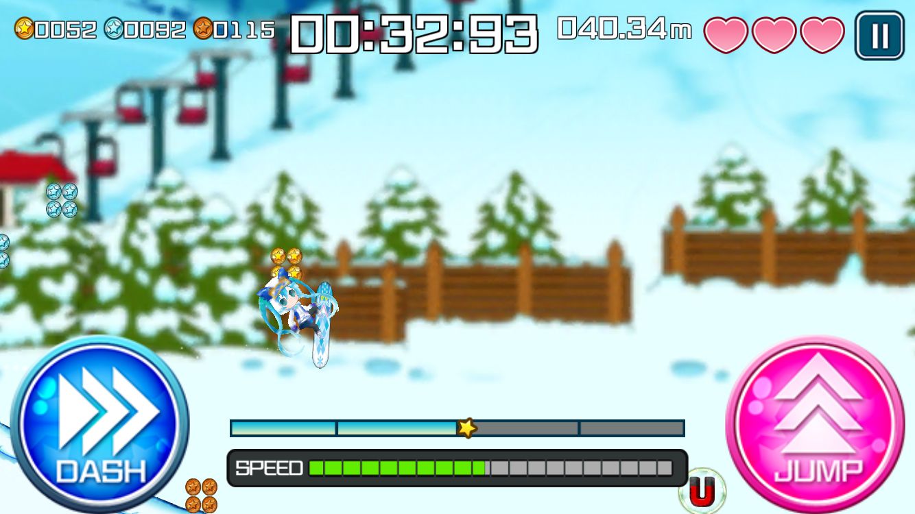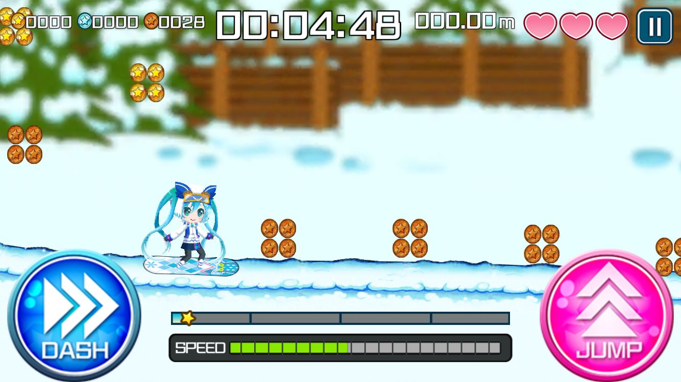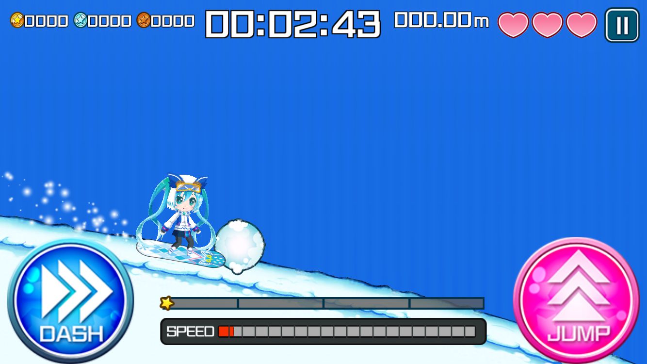 これが意外と難しく、コースによって途中でゲレンデがあったりして、ジャンプしたら勢いがありすぎて上の氷にぶつかったり、ボードにスピードが乗らなくて先に進めなかったり、速すぎてミクの体勢を崩してしまったり、雪だるまやつららが落ちてきてスピードの妨げになったりと大忙しです。