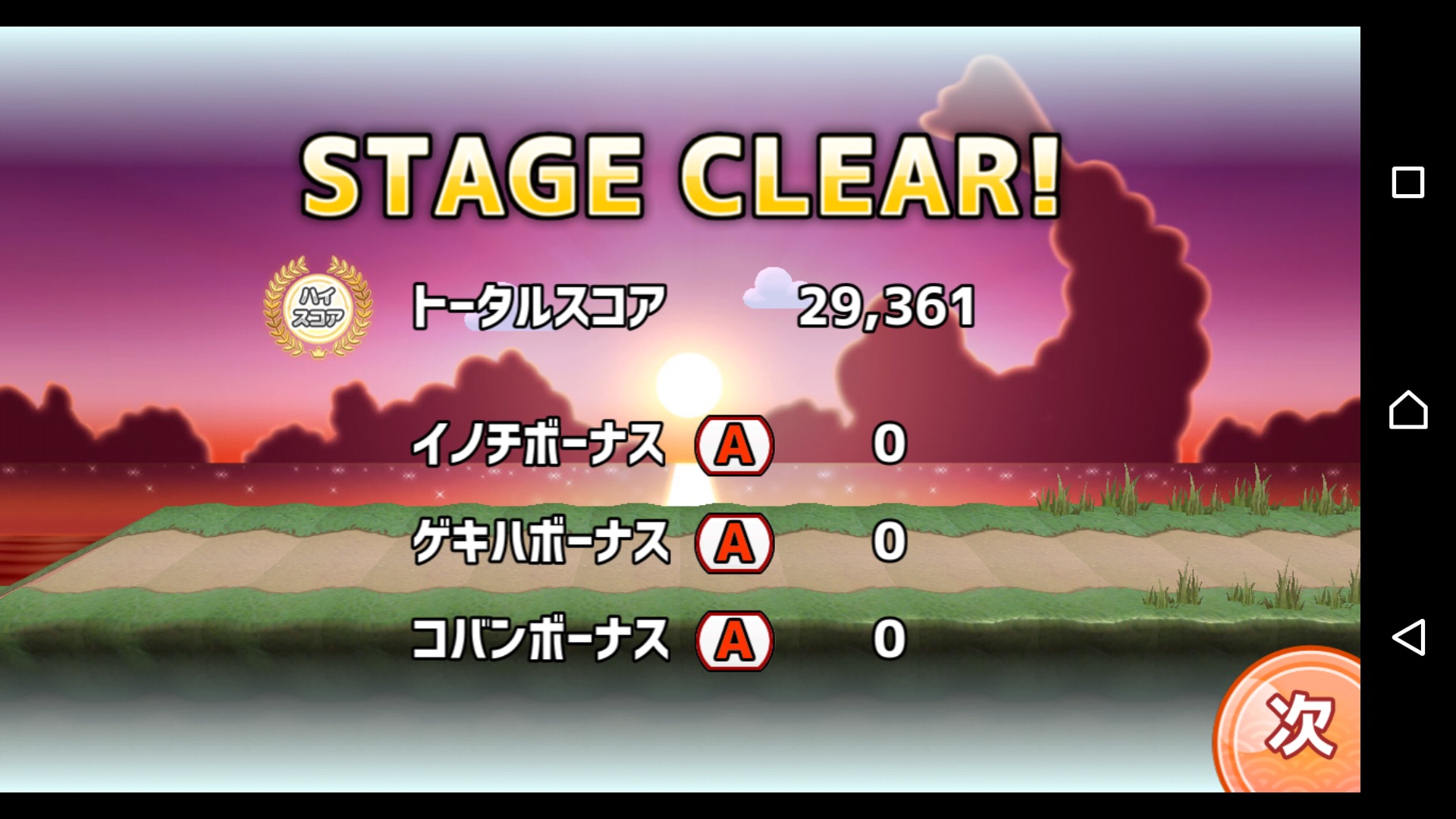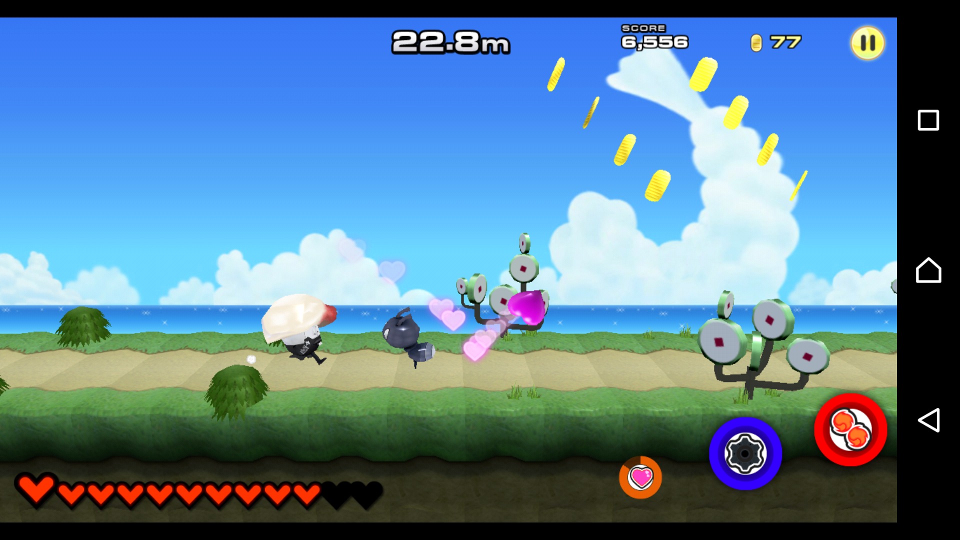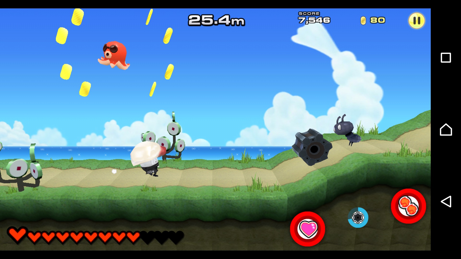 基本アクションは、走る、跳ぶ、攻撃するの3種。走るのは自動で行われるので、実際にプレイヤーが操作するのは、ジャンプと攻撃のみ。画面の適当なところをタップするとジャンプ、右下の丸で囲まれた所をタップすると攻撃、となるのでゲームに不慣れな人でも簡単にプレイできるはず!