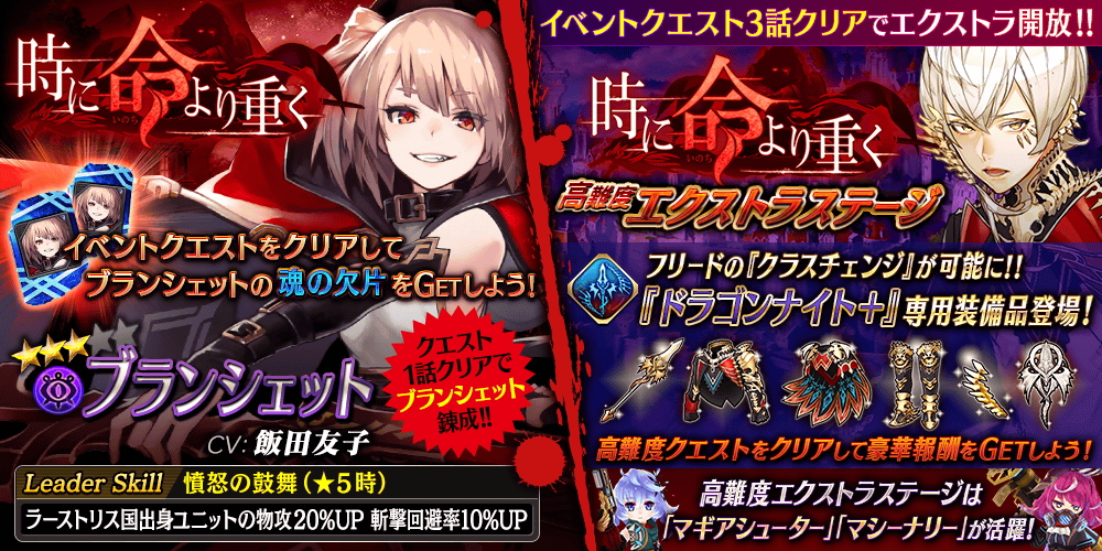 株式会社gumiは、スマートフォン向けゲームアプリ第2弾『誰ガ為のアルケミスト(タガタメ)』にて、4月13日(木)15:00より、新ユニット「ブランシェット」が獲得可能なイベント「時に命より重く」が開催中です。また、「フリード」が「ドラゴンナイト+」になるための証が手に入る高難度エキストラステージも登場!