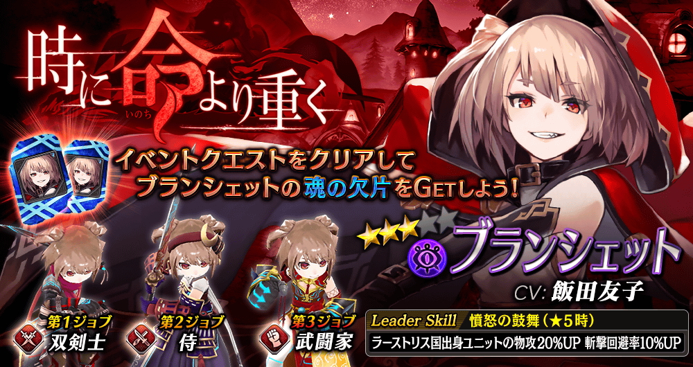 イベント1話のクエストミッションをクリアすると、イベント限定ユニット「ブランシェット」が錬成可能になります。また、各話のクエストミッションクリアで「ブランシェットの魂の欠片」が獲得できるので、「ブランシェット」を手に入れて強化しましょう!
