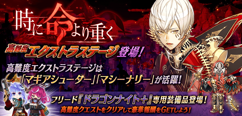 高難度エクストラステージでは、イベントストーリーに登場する「フリード」が「ドラゴンナイト+」へクラスチェンジできます。「フリード」の「ドラゴンナイト+」の専用装備品の図片や、「ドラゴンナイト+」になるために必要な「証」が入手可能!