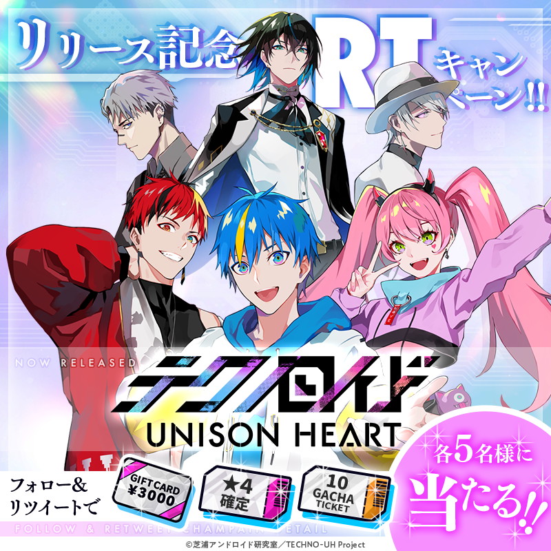 本キャンペーンでは、『テクユニ』公式Twitterアカウント(@technoroid_game)および「テクノロイド」公式Twitterアカウント(@TECHNOROID_info)をフォローし、対象ツイートをRTすると、抽選で各5名に★4確定ガチャチケット、10連プレミアムガチャチケット、Amazonギフトカード3,000円分が当たります。