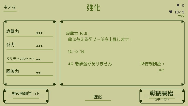 モンスターを倒すことで、報酬金が手に入ります。手に入れた報酬金で勇者の「攻撃力」「体力」「クリティカルヒット」「回復力」のステータス強化を行いましょう!強化画面の左下にあるボタンを選択して、広告動画を視聴するだけで報酬金を手に入れることもできます。
