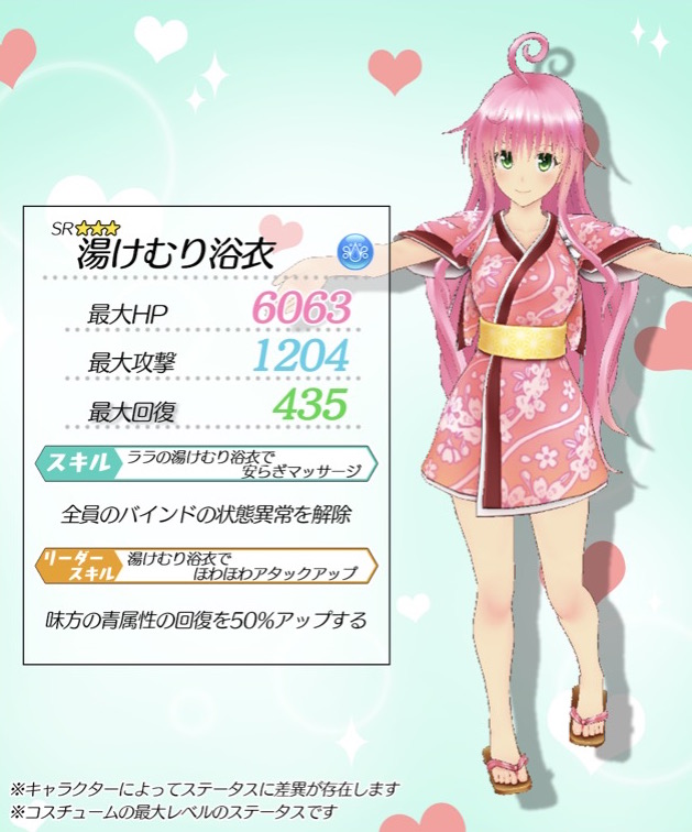 新コスチュームは、同時開催中のイベント「ララとの温泉旅行」のみ全ステータスが5倍に、獲得イベントポイントが2倍になる特効コスチュームとなっています。