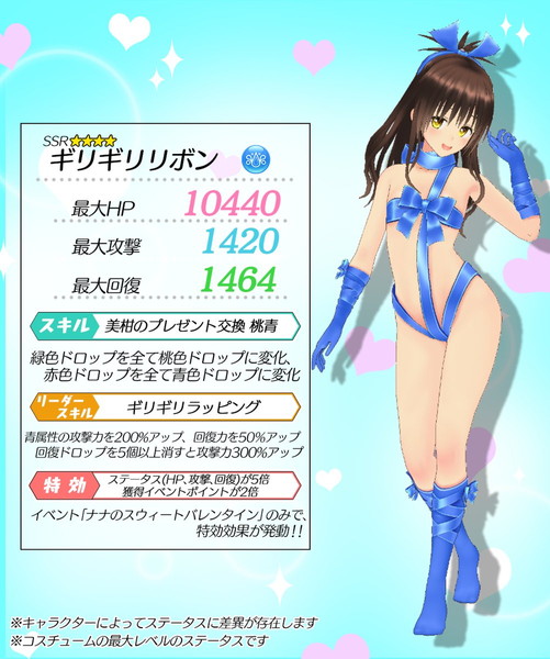 また、新コスチュームの「プレゼントリボン」「ギリギリリボン」は、同時開催中のイベント「ナナのスウィートバレンタイン」で、全ステータス(HP、攻撃力、回復力)が5倍、獲得イベントポイントが2倍になる特攻コスチュームです。