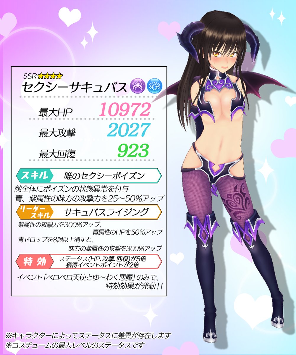 今回登場した新コスチュームは同時開催中のイベント「ペロペロ天使とゆ~わく悪魔」で、全ステータス(HP、攻撃力、回復力)が5倍に、獲得イベントポイントが2倍になる特攻コスチュームになっています。