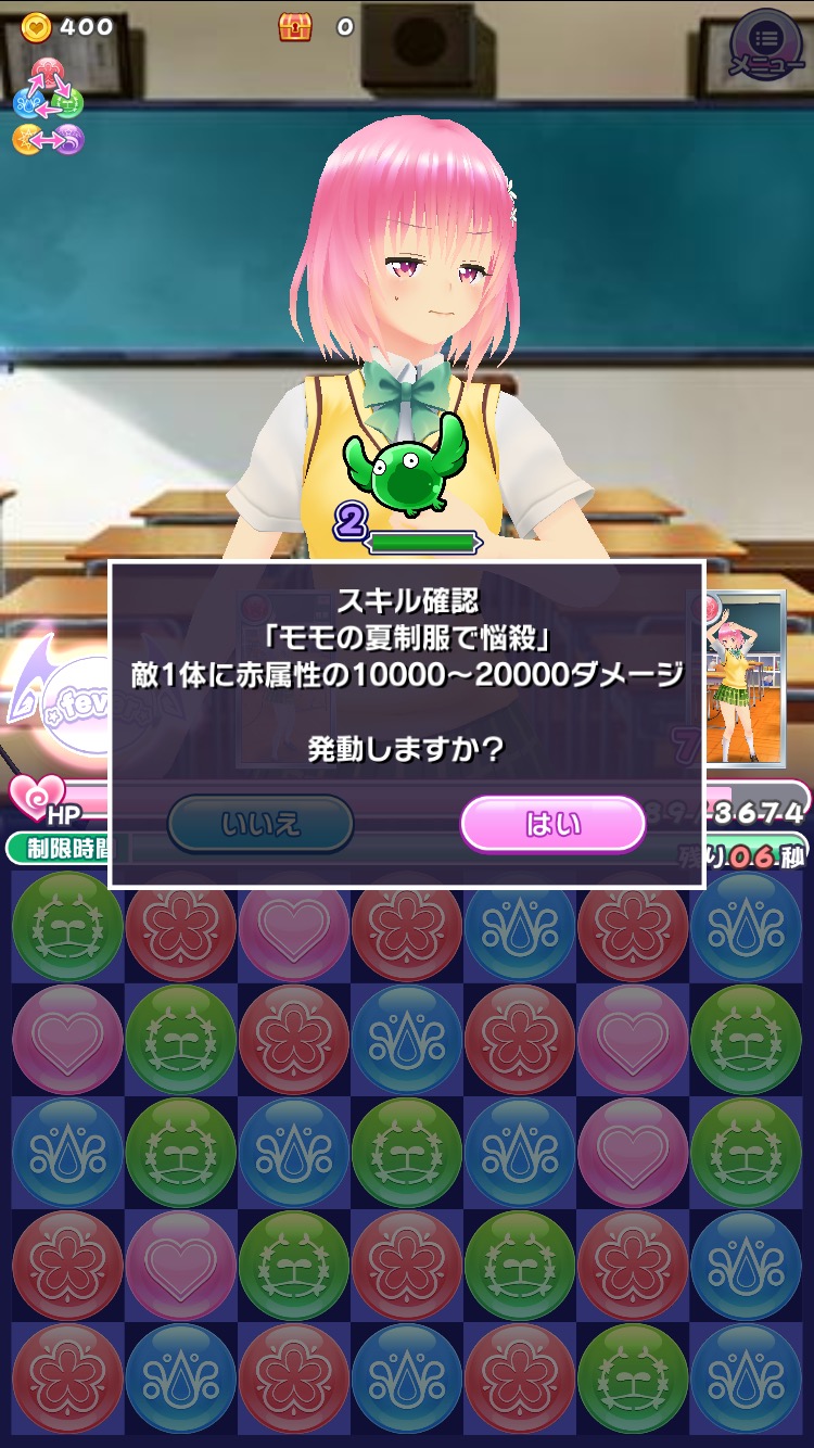 「フィーバータイム」中には、パズル画面上部にヒロインのキュート&セクシーな姿が表示されます。正直、こちらにの可愛らしさに気を取られてしまってパズルに集中できないのが難点…自分を律して敵を撃破しましょう!