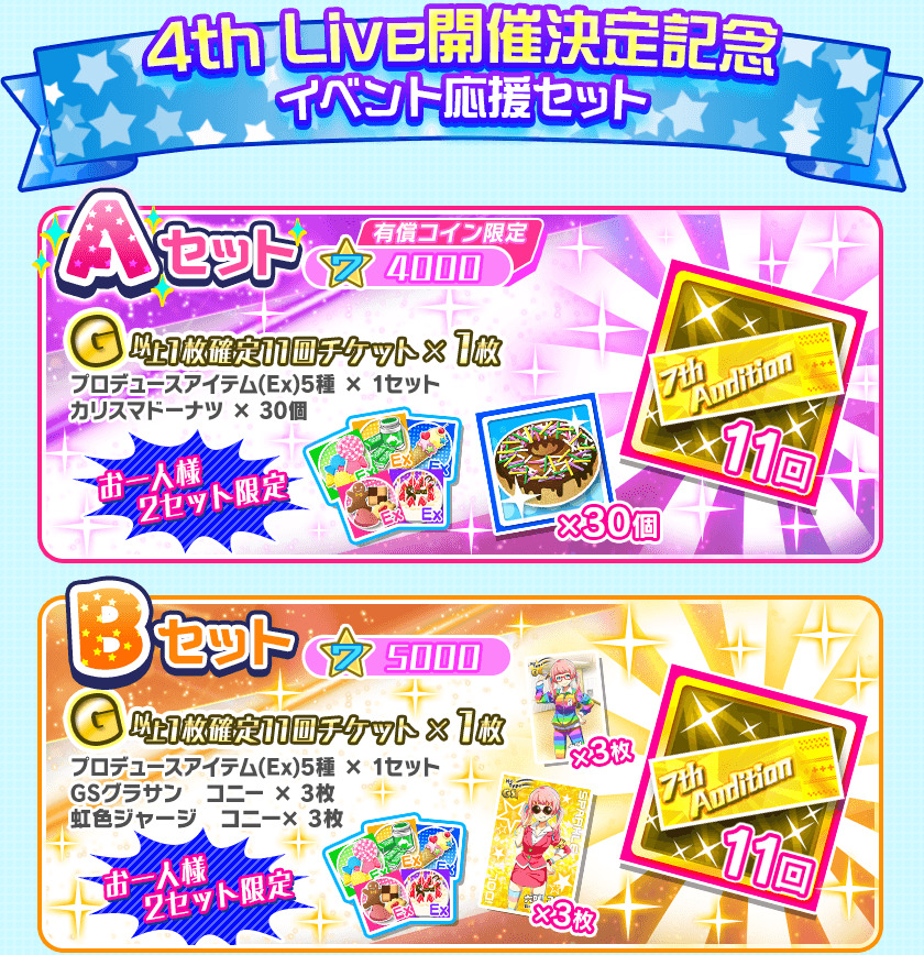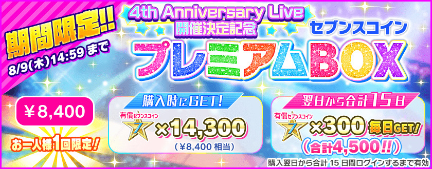 お得にセブンスコインを購入できる「4th Anniversary Live開催決定記念セブンスコインプレミアムBOX」が販売中です。本BOXは、購入時に14300コインが獲得できるほか、翌日から15日間ログインすると最大4500コイン、合計18800コインが獲得できます。