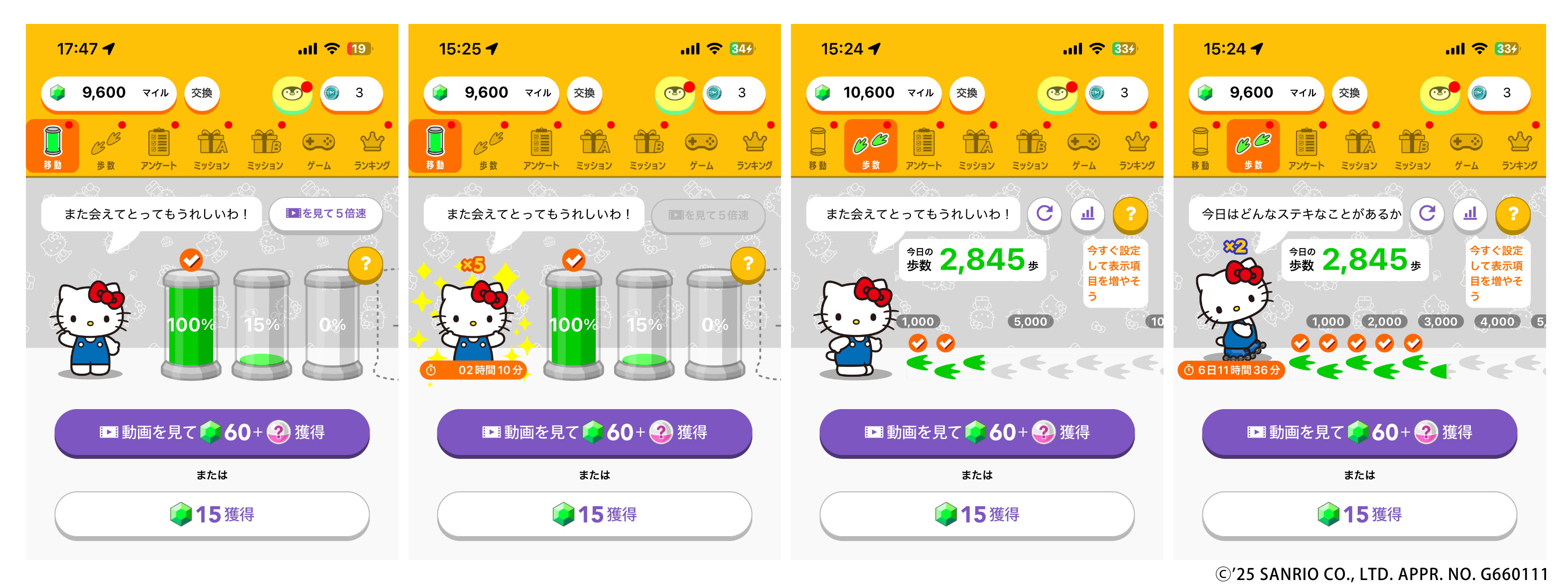 アプリ内の移動画面および歩数画面に表示されるキャラクターを、お好きなサンリオキャラクターズに変更できます。ハローキティをはじめ、毎月異なるキャラクターが順次登場します。