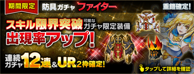 「ドラグニル」シリーズ・「プロメテウス」シリーズのように、ボーナス効果によりクラス別のスキルレベルがアップするガチャ限定防具や、「レギンガルド」シリーズのように、優れたボーナス効果を有するガチャ限定防具が通常の3倍の確率で出現中!