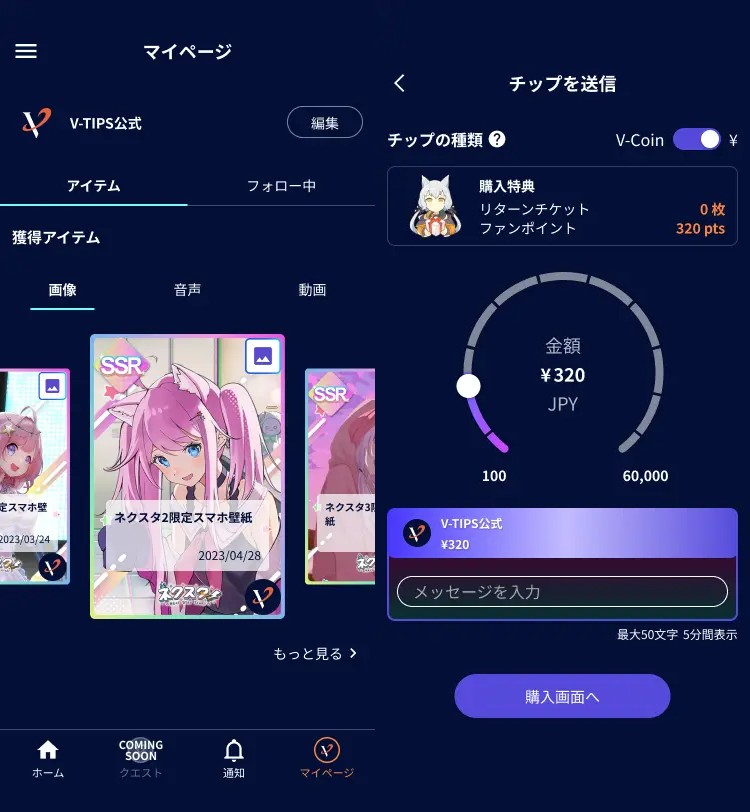 ※独自の投げ銭機能「Vコイン」は現状ブラウザ版のみ対応。アプリは2024年夏頃の対応が予定されています。
