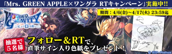オープニングムービーの公開を記念して、主題歌「SPLASH!!!」を歌う「Mrs. GREEN APPLE」のメンバーの直筆サイン入り色紙が当たる、「Mrs. GREEN APPLE×ワングラ RTキャンペーン」 を開催中! 『ワンダーグラビティ』公式Twitterにて、抽選で5名に「Mrs. GREEN APPLE」のメンバー全員のサインが入ったオリジナル色紙 がプレゼントされます。