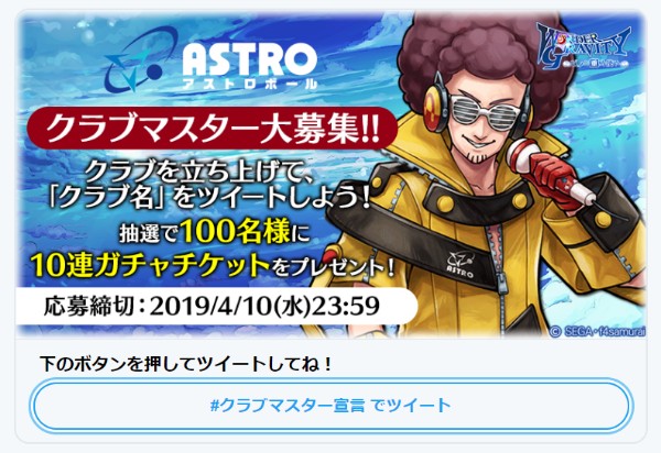 『ワンダーグラビティ ~ピノと重力使い~(ワングラ)』にて、本日2019年4月2日(火)より、リアルタイムバトル「アストロボール」の開幕に向けて、公式Twitterで「アストロボール」の「クラブマスター」になったことを宣言すると、抽選で100名に「10連ガチャチケット」が当たる「クラブマスターキャンペーン」が開催中です。