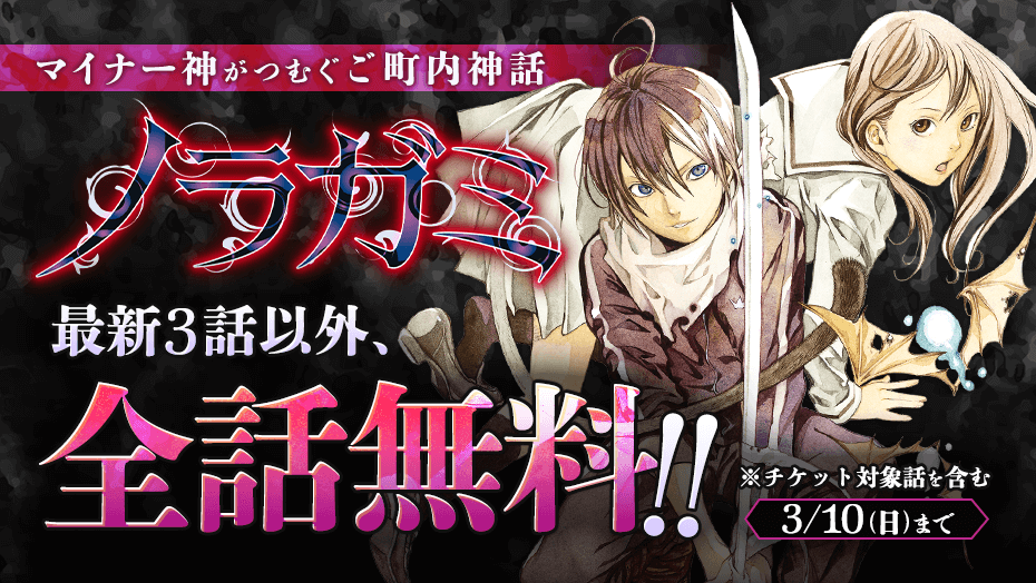 漫画アプリ「マガポケ」にて、『ノラガミ』の完結を記念して、2024年3月10日(日)まで、最新3話以外、全話無料配信されています。