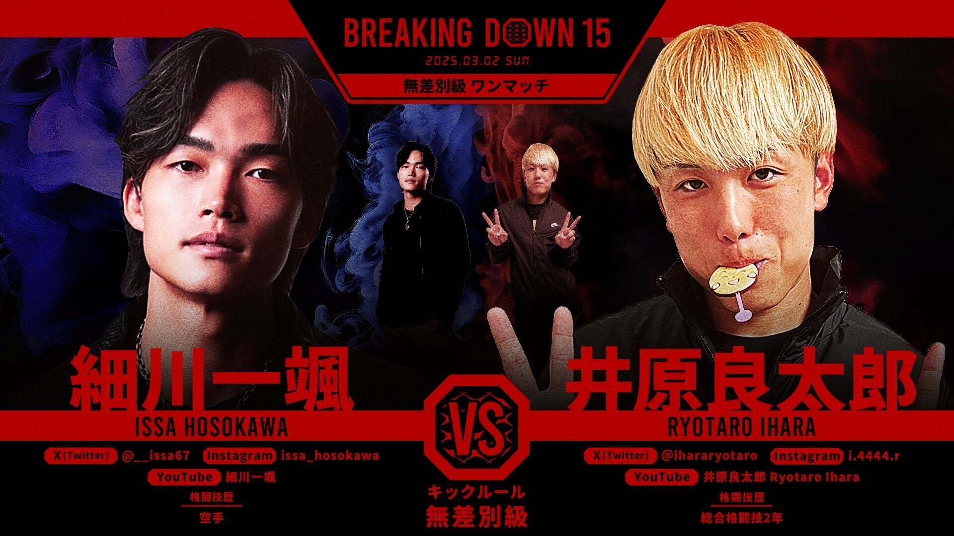 『BreakingDown』は、"1分間最強"を決めるをコンセプトに朝倉未来氏がプロデューサーを務める新感覚の格闘エンターテインメントです。今回の大会では、細川一颯選手vs.井原良太郎選手をはじめ、野田蒼選手vs.レオ選手など、注目の対戦カードが決定しています。