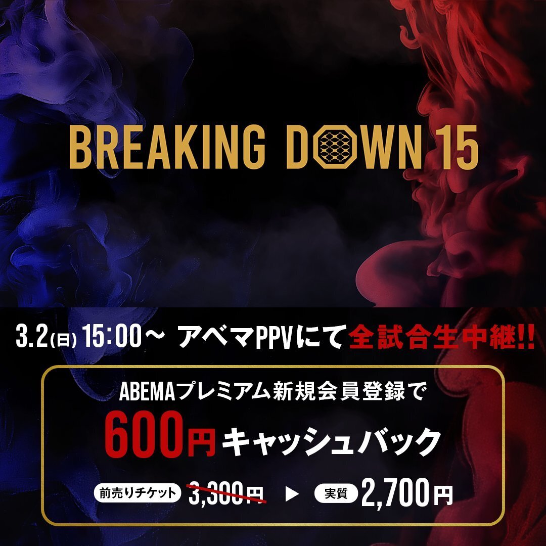 新しい未来のテレビ「ABEMA」の「ABEMA PPV(アベマ ペイパービュー)」おいて、2025年3月2日(日)15:00より、『SILK THE RICH presents BreakingDown15』が全試合生中継されます。