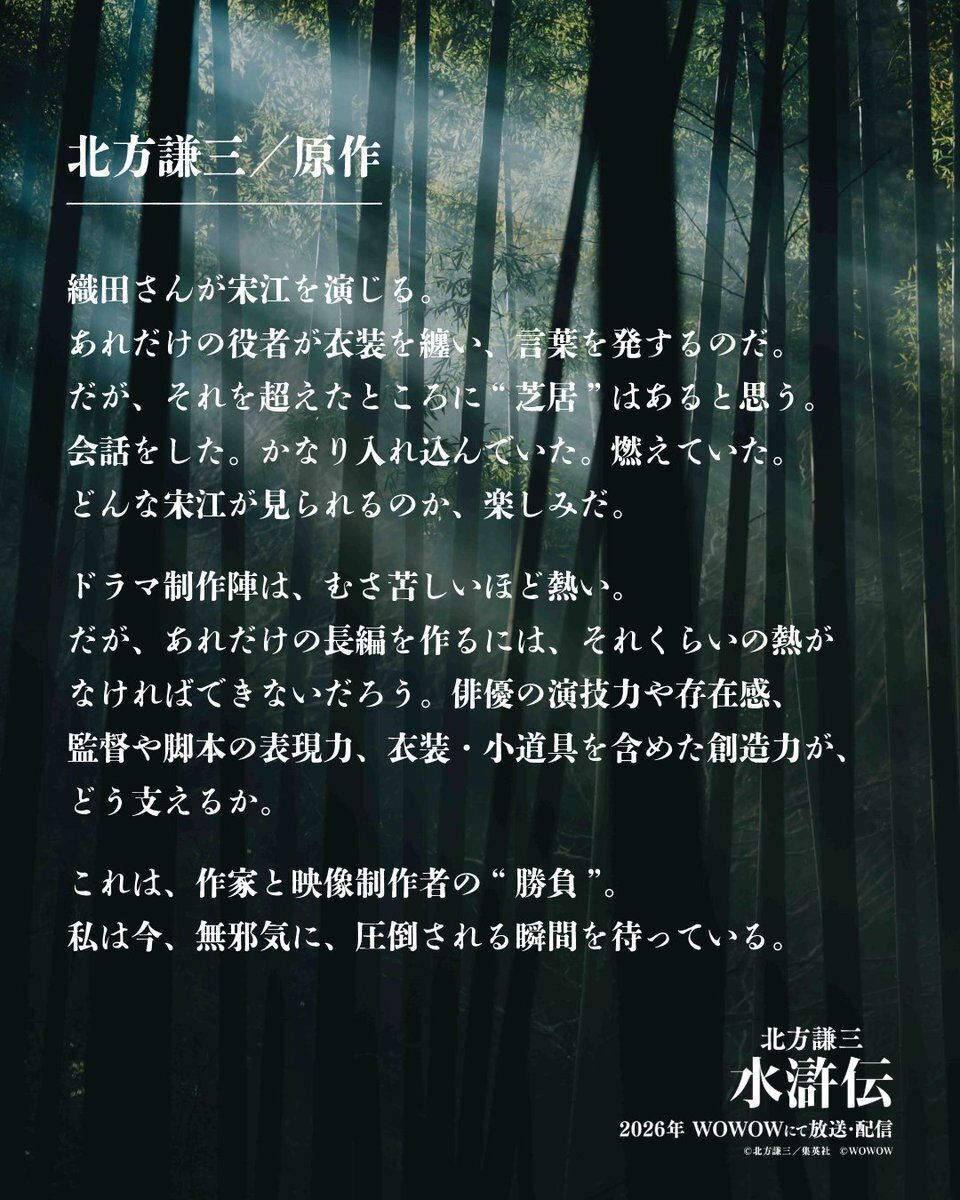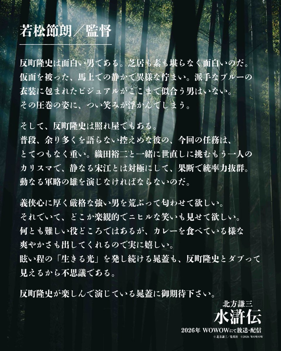巨匠・北方謙三の大河小説『水滸伝』が、ついに動き出す。シリーズ累計発行部数1,160万部を超える金字塔を、圧倒的スケールで完全映像化。交わる想い、試される絆――これは、“信じる心が時代を動かす”熱き人間ドラマ。主演・織田裕二をはじめとする豪華キャストが集結。